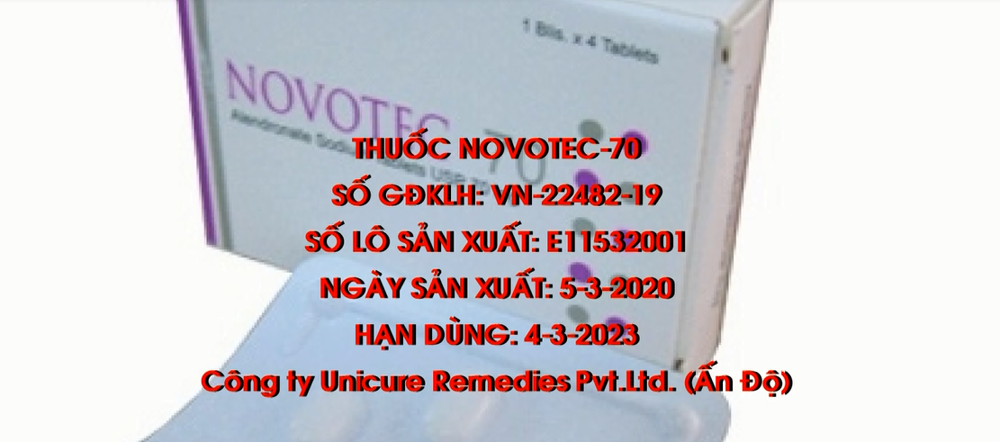 Cục Quản lý dược , Bộ Y tế vừa có quyết định xử phạt hành chính, buộc tiêu hủy toàn bộ lô thuốc điều trị loãng xương Novotec-70 do vi phạm chất lượng mức độ 2. Công ty sản xuất của Ấn Độ bị phạt 70 triệu đồng và buộc tiêu hủy toàn bộ số thuốc vi phạm. Cơ sở nhập khẩu lô thuốc là Công ty cổ phần Dược liệu trung ương 2 thực hiện thu hồi và khắc phục hậu quả. Cục Quản lý dược cũng xử phạt hành chính 2 đơn vị: Công ty cổ phần Dược phẩm Phương Đông, công ty cổ phần US Pharma USA không thực hiện thủ tục đăng ký thay đổi, bổ sung giấy đăng ký lưu hành với cơ quan nhà nước có thẩm quyền và được phê duyệt trước khi lưu hành thuốc đối với 1 số mặt hàng thuốc.