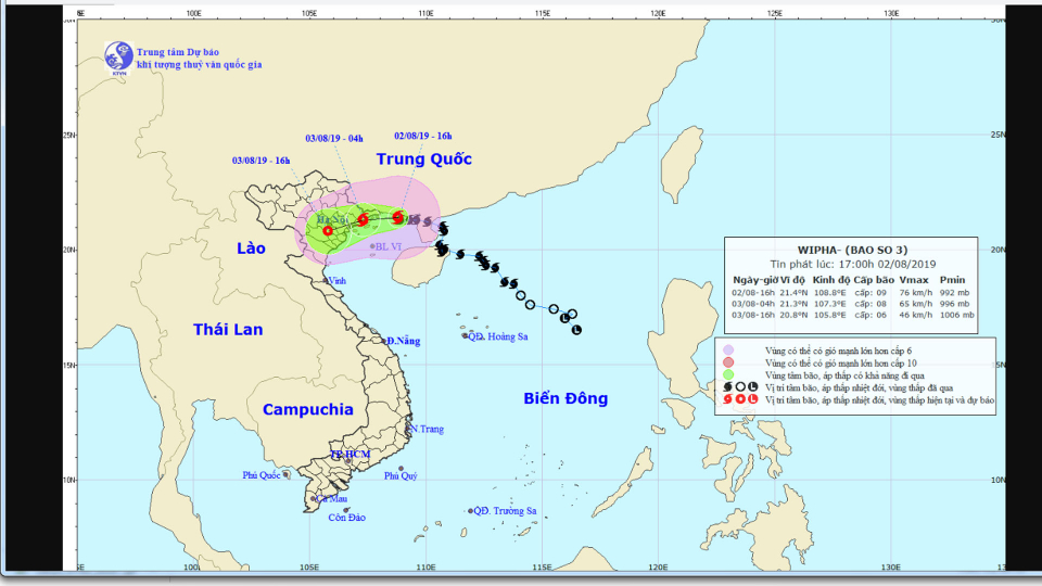Hồi 16 giờ ngày 02/8, vị trí tâm bão ở vào khoảng 21,4 độ Vĩ Bắc; 108,8 độ Kinh Đông; cách Móng Cái khoảng 90km, cách Hải Phòng khoảng 250km, cách Nam Định khoảng 310km. Sức gió mạnh nhất vùng gần tâm bão mạnh cấp 9 (75-90km/giờ),giật cấp 12. Bán kính gió mạnh cấp 6,giật cấp 8trở lên khoảng 150km tính từ tâm bão.