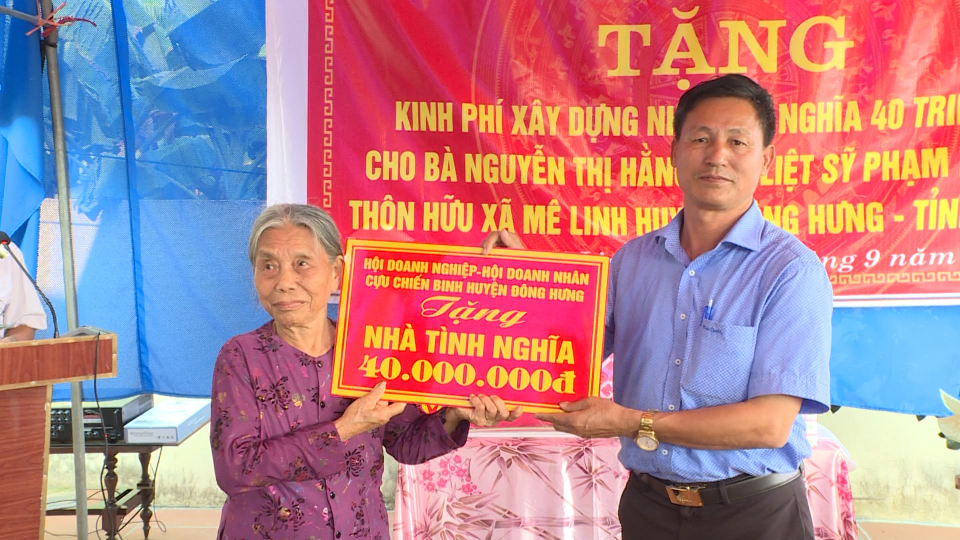 Hội Doanh nghiệp Cựu chiến binh tỉnh Thái Bình phối hợp với Hiệp hội Doanh nghiệp huyện Đông Hưng, cùng cấp ủy Đảng chính quyền địa phương trao nhà nghĩa tình đồng đội cho bà Nguyễn Thị Hằng, vợ liệt sĩ Phạm Ngọc Biên, thôn Hữu, xã mê Linh, huyện Đông Hưng.