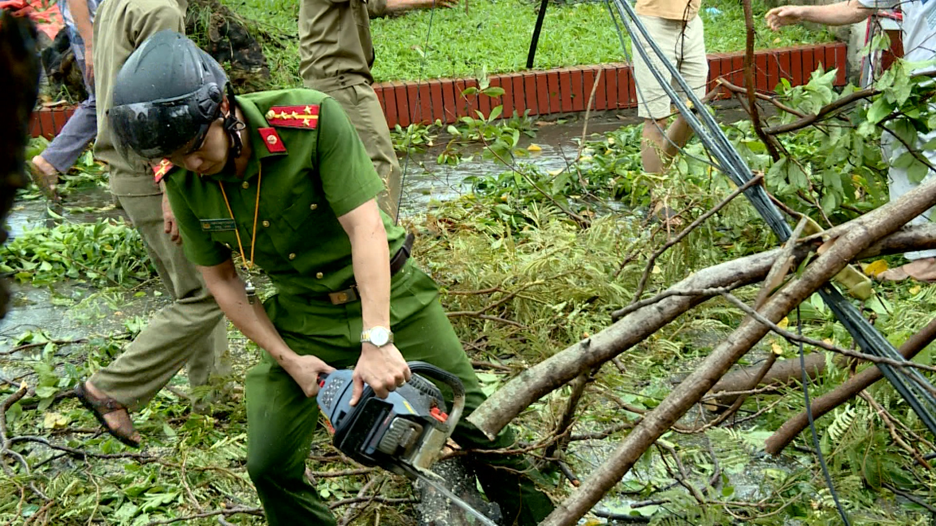 Để nhanh chóng khắc phục hậu quả, lực lượng Công an, quân sự thành phố huy động cán bộ chiến sỹ tham gia hỗ trợ giải tỏa cây xanh, điều tiết giao thông để phục vụ việc thu dọn cây xanh gẫy đổ trên các tuyến đường phố đảm bảo an toàn.